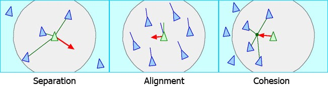 dans sa version originale chaque animal décide de sa trajectoire, en fonction uniquement de ses voisins proches, et cela en suivant trois règles: