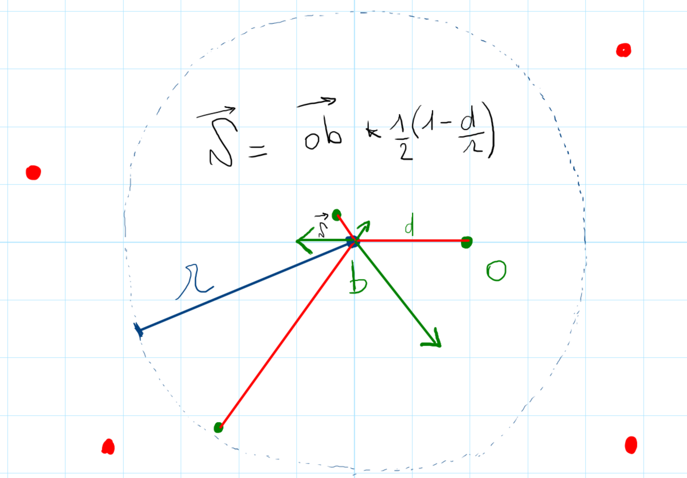 et pour les 3 boids proches - en vert - on fait la somme des 3 vecteurs de “repoussement” (en vert aussi)