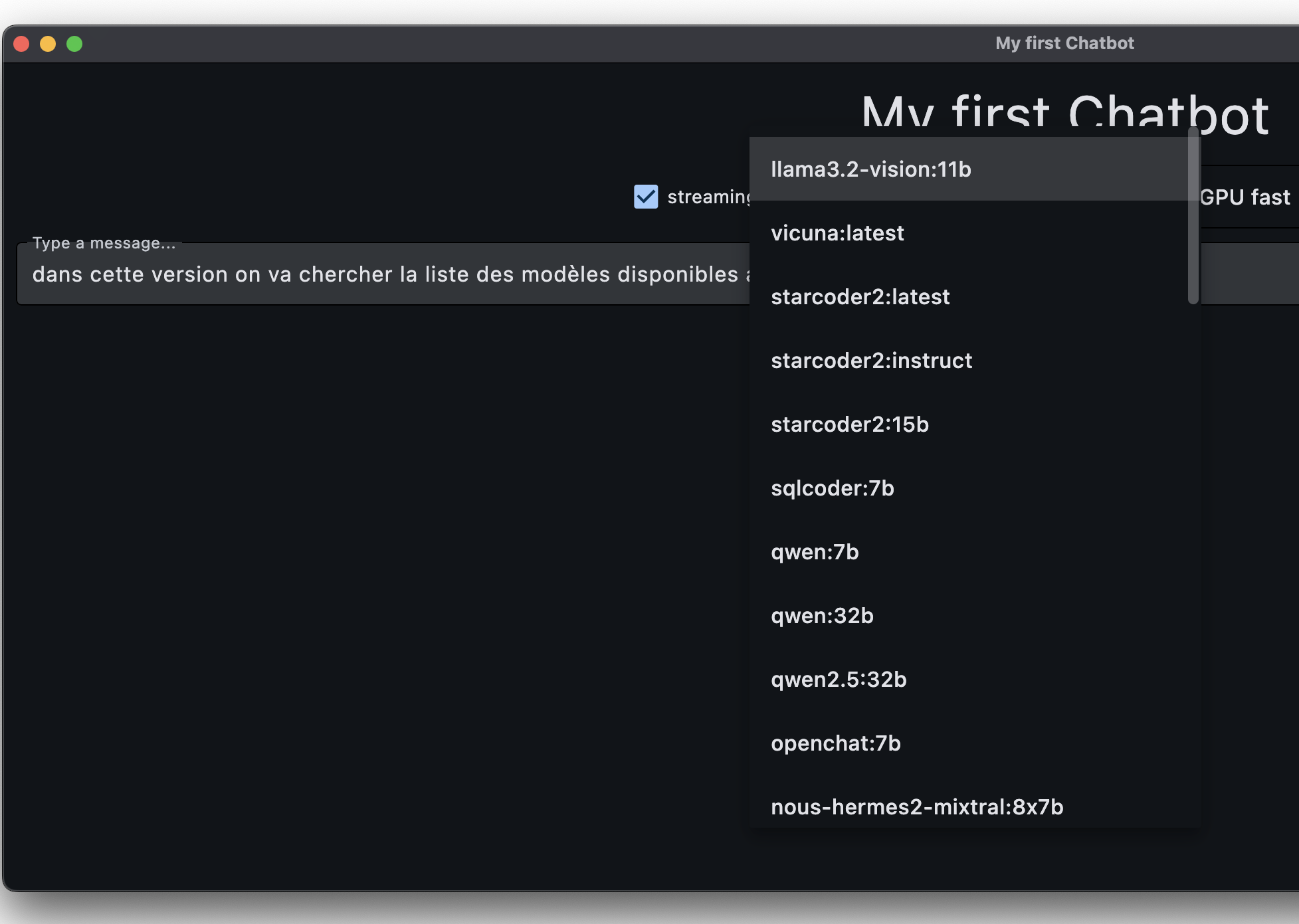 plutôt que de proposer une liste de modèles “en dur” comme dans le starter code, on pourrait à ce stade acquérir, auprès du serveur choisi, la liste des modèles connus; pour cela ollama met à notre disposition l’API /api/tags