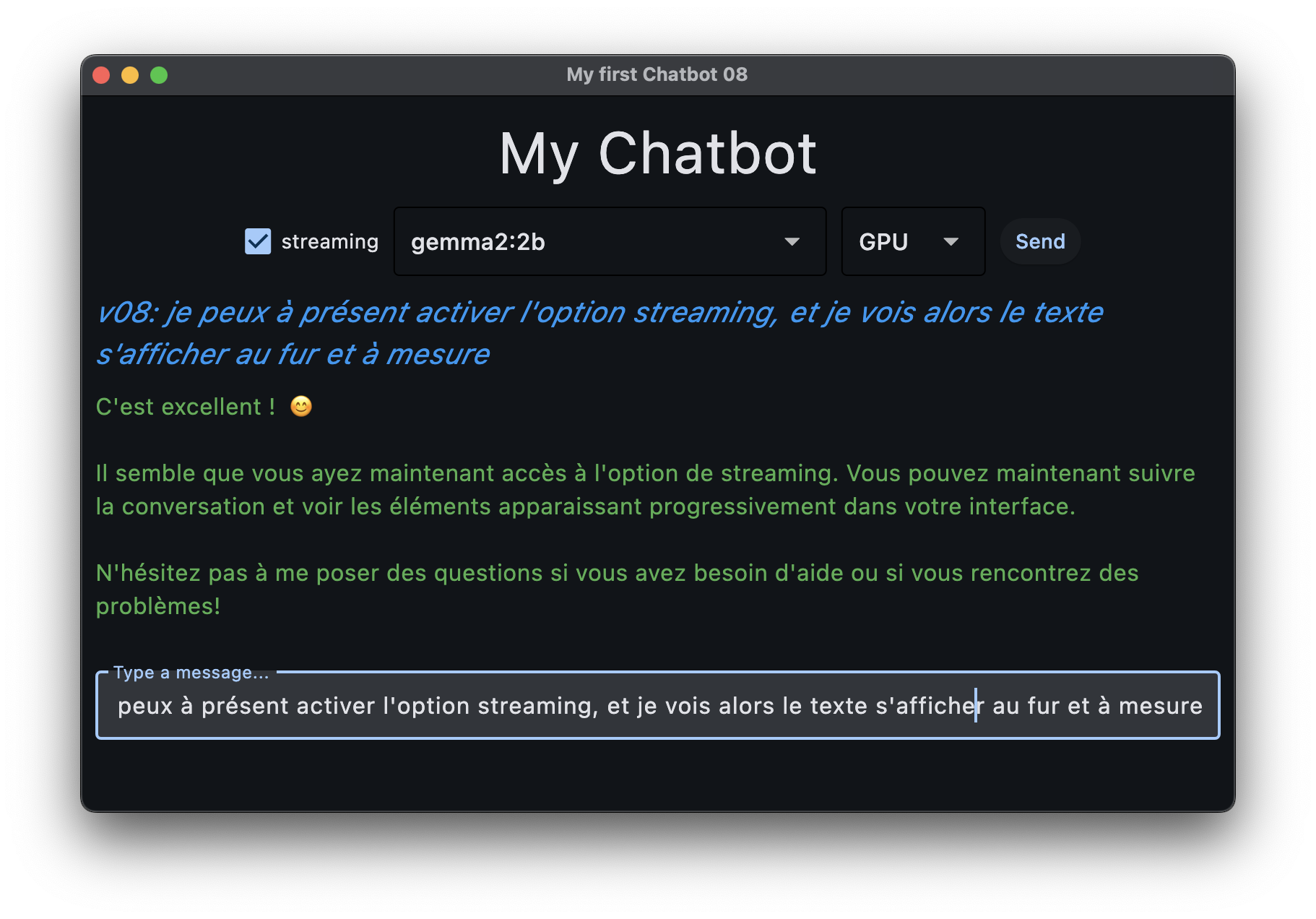 dans notre cas toutefois, ce modèle n’est pas tout à fait adapté, car l’IA met du temps à élaborer sa réponse, et on aimerait mieux voir la réponse au fur et à mesure, plutôt que de devoir attendre la fin, qui est le comportement que vous obeservez si vous avez suivi mes indications jusqu’ici