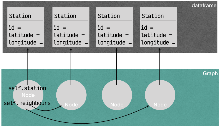 Station: contient les détails de l’arrêt ; ici on n’a gardé, parmi tous les détails exposés par la RATP, que les coordonnées latitude et longitude, mais dans un exemple plus réaliste on pourrait avoir ici plein de détails...Node: modélise un noeud (sommet) dans le graphe, et ses noeuds voisins ;Graph: contient l’ensemble des noeuds du réseau.